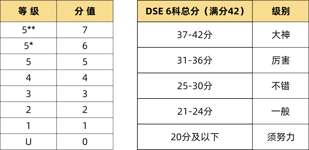 DSE考試采取等級考評分制,DSE課程的每一科成績都會有8個等級,分別為5**、5*、5、4、3、2、1、U,對應分值是7、6、5、4、3、2、1、0分。一等級計作1分,5**等級則可以計7分,單科滿分7分。