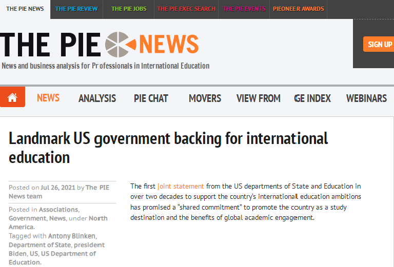 據(jù)知名國際教育網(wǎng)站The PIE News報道,這是二十多年來,美國國務院和教育部首次聯(lián)合聲明支持美國國際教育,聲明將大力促進美國成為國際學生的留學目的地,助力全球?qū)W術(shù)交流,具有里程碑的意義。