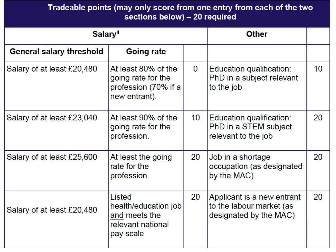 另外申請人薪資如高于25,600英鎊,即可獲得額外20分。如低于此工資水平,則需考量以下條件是否滿足,而獲得20分的加分: