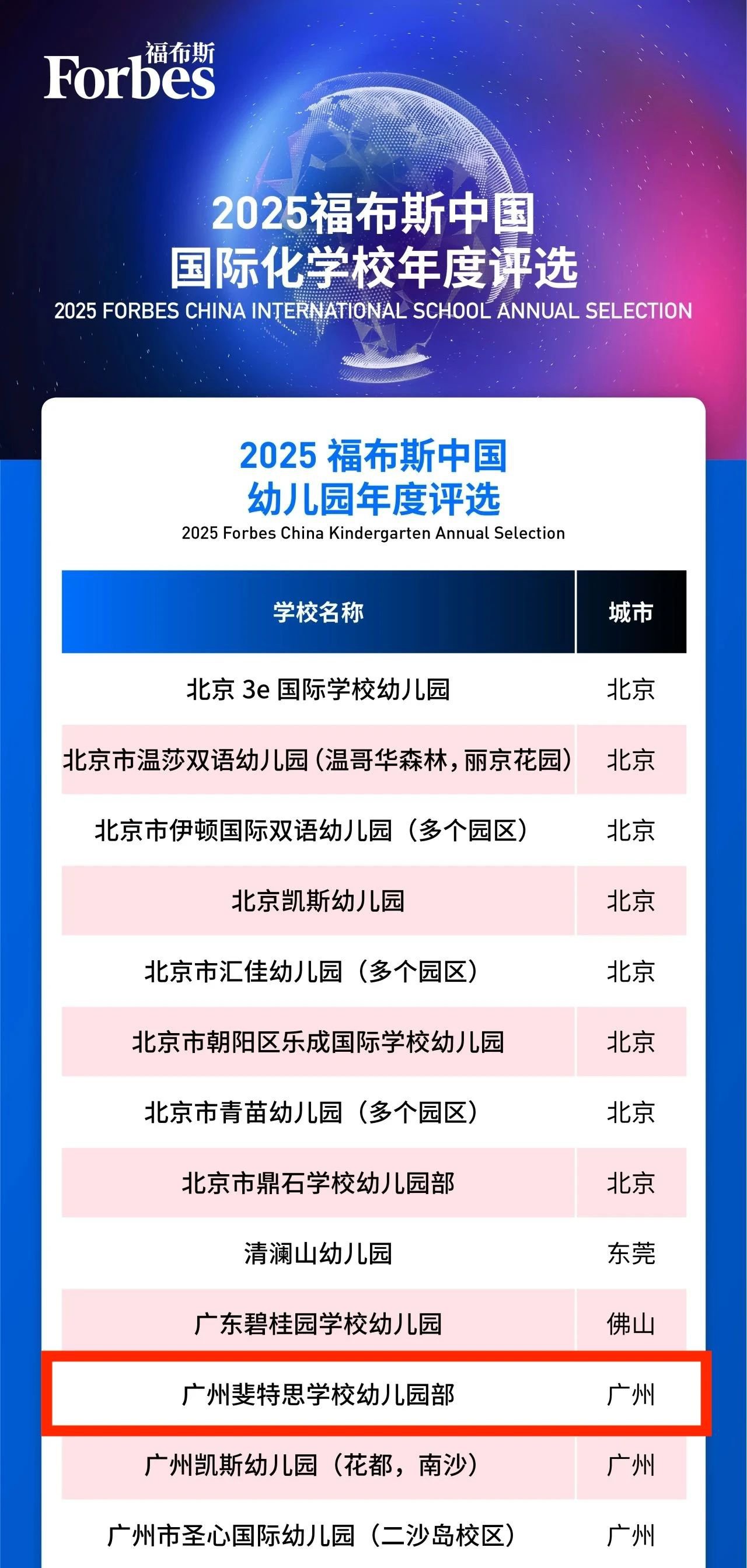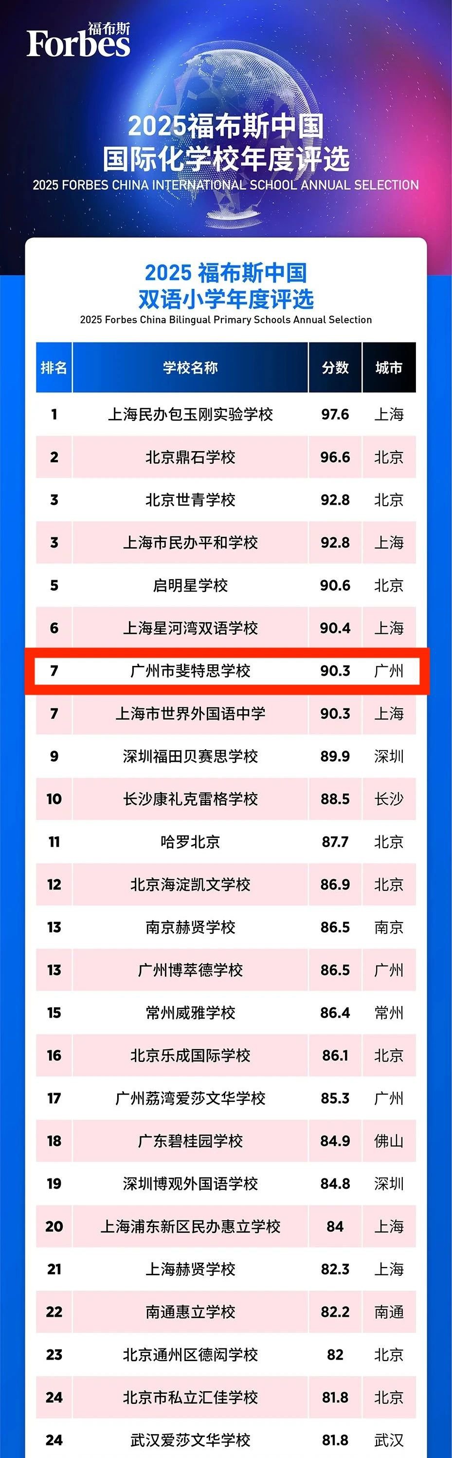 廣州市斐特思學校高中部、初中部、小學部及幼兒園均位列廣州市雙語學校第一!廣州斐特思實現連續四年霸榜,在2025福布斯中國國際化學校年度評選中再創新高。