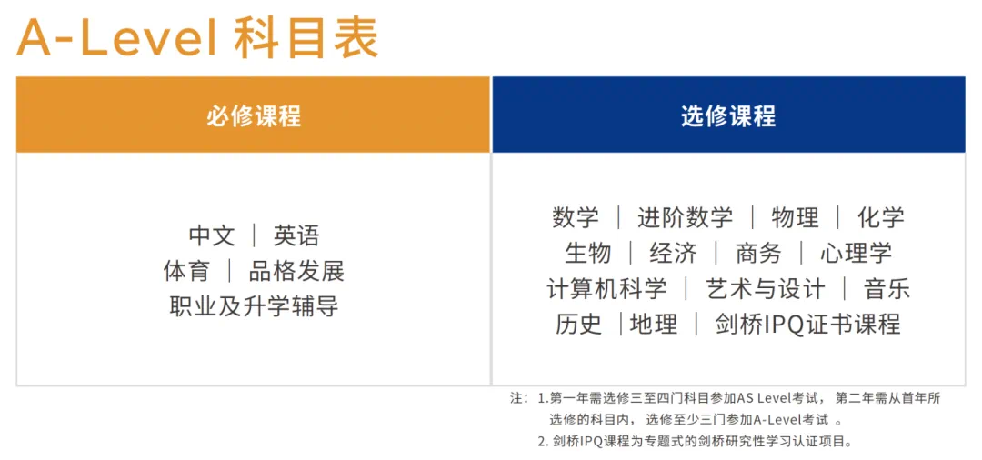 普通教育高級證書(A Level)以劍橋大學國際考評部(CAIE)的普通教育高級證書(A Level)課程為基礎,以英語為主要教學語言。A Level提供多樣化的科目選擇,學生可據個人職業規劃、興趣特長等選讀最適合自己的科目。課程和考試受國際認可,為學生日后進入海外頂尖大學作好全面準備,幫助他們在未來世界中扮演重要角色及奠定堅實基礎。