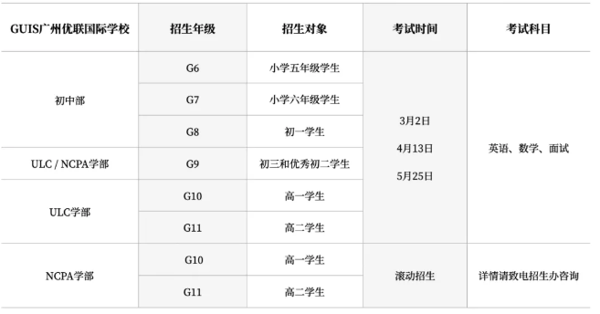 ULC學(xué)部、NCPA學(xué)部G9年級(jí)入學(xué)考試統(tǒng)一進(jìn)行,學(xué)生可自由填寫志愿申請(qǐng)ULC或NCPA,在符合錄取條件的基礎(chǔ)上,學(xué)校根據(jù)學(xué)生志愿發(fā)放錄取。