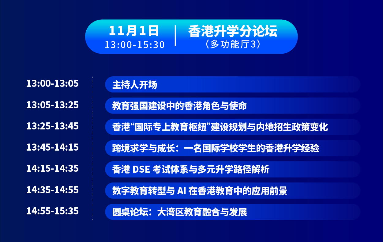伴隨大灣區教育融合發展,香港憑借其國際化的學術環境與地緣優勢,成為升學新高地。本論壇全面剖析香港高校的招生政策、升學優勢與就業方向,探討香港學歷賦予學生的全球發展機會,助力家庭把握機遇,為子女規劃一條立足大灣區、面向未來的成長通道。