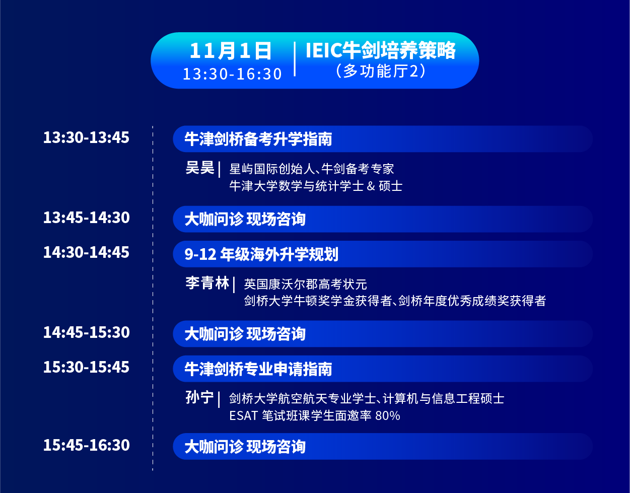 英國牛津、劍橋等TOP學府依然是無數學子心中的學術高地。本論壇以“牛劍G5英本頂尖申請策略”為主題,匯聚前牛劍錄取者及國際競賽與科創規劃專家,系統解析從學科深耕、競賽突破到科創實踐的全鏈路培養路徑。為志在沖擊牛劍及英國G5超級精英大學的學生與家長,提供學術規劃與申請指導。
