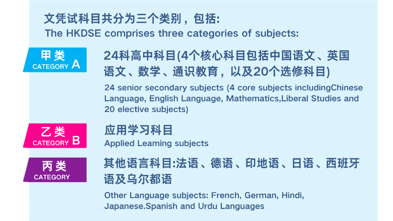 甲類(A):24科高中科目(4個核心科目包括中文、英文、數學、公民社會發展,,以及20個選修科目)