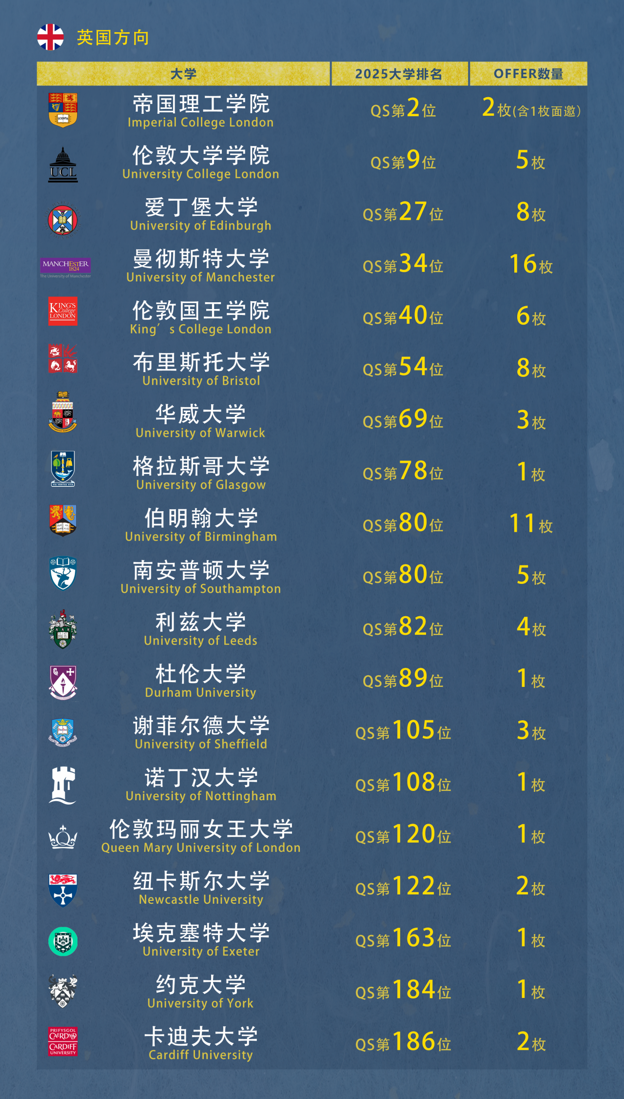 G5 超級精英大學(xué)閃耀登場:斬獲1 封帝國理工學(xué)院(QS 世界排名第 2)、5 封倫敦大學(xué)學(xué)院(UCL)(QS 第 9)、8 封愛丁堡大學(xué)(QS 第 27)、16 封曼徹斯特大學(xué)(QS 第 34)等 offer,共計(jì) 80 份英國 Top100 大學(xué)錄取,延續(xù) “英國申請領(lǐng)跑者” 優(yōu)勢。
