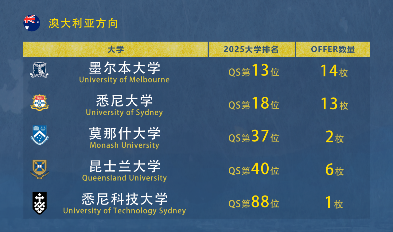 因?qū)W制、距離、排名等優(yōu)勢,澳洲方向備受學(xué)子青睞,本屆共計(jì)斬獲 36 份錄取,其中 35 封來自澳洲八大,具體包括澳洲八大排名第一的墨爾本大學(xué) 14 枚、悉尼大學(xué) 13 枚、莫那什大學(xué) 2 枚、昆士蘭大學(xué) 6 枚。