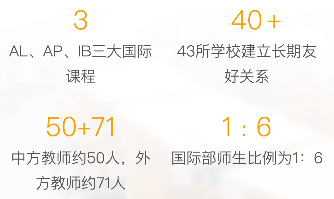 十一學校國際部開設AL/AP/IB三大國際課程,與43所學校進行教育交流,同時擁有50位中方教師,71位外方教師,達到1:6的師生比。