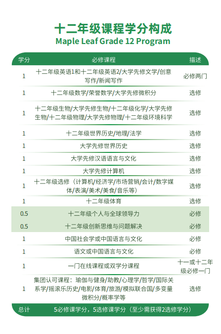 學(xué)生每學(xué)年學(xué)習(xí)10門楓葉世界學(xué)校課程,學(xué)習(xí)合格后取得相應(yīng)學(xué)分。楓葉世界學(xué)校課程高中畢業(yè)要求: