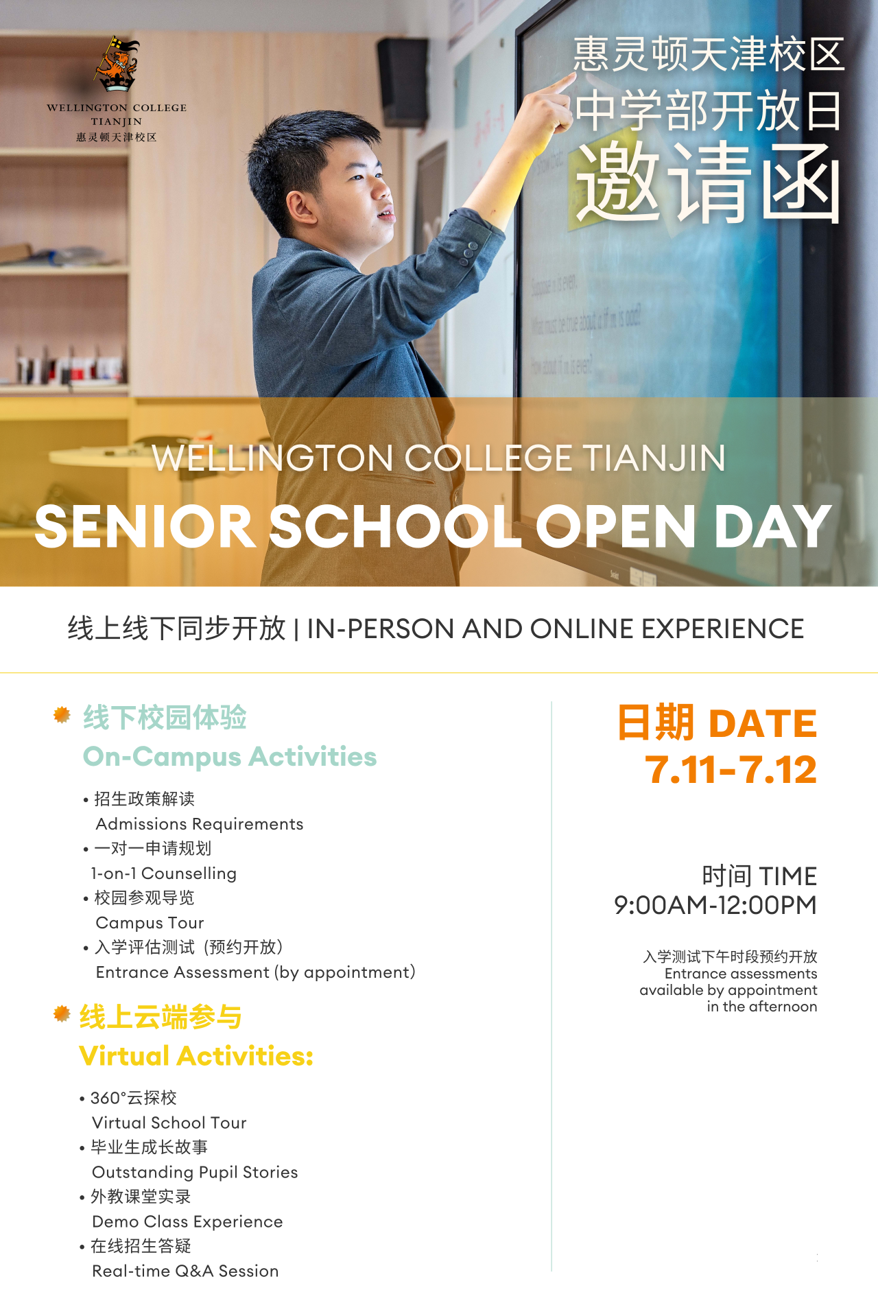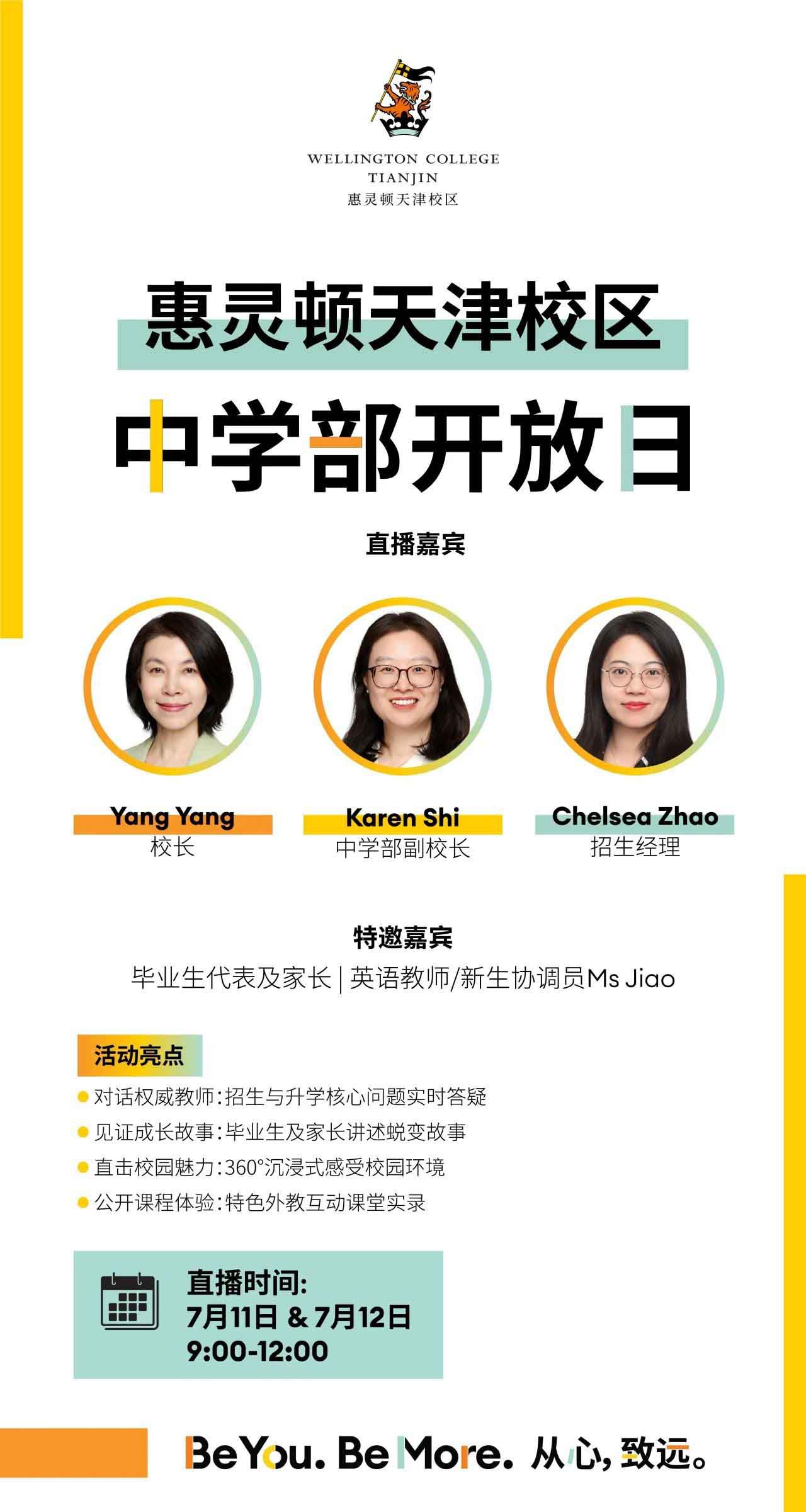 隨著中考的結束,您是否正在帶著這些疑問為孩子的高中教育尋找一個卓越的起點?7月11日-12日,惠靈頓天津校區中學部將舉辦線上線下同步開放日,為家長和學生提供沉浸式探校體驗。無論您選擇云端參與,還是親臨校園,都能深度了解學校的教育理念、課程體系及招生政策,更有機會現場咨詢并參加入學評估。若您正處于教育選擇的關鍵階段,不確定國際教育是否適合您的孩子——本次開放日活動正是為您量身打造!