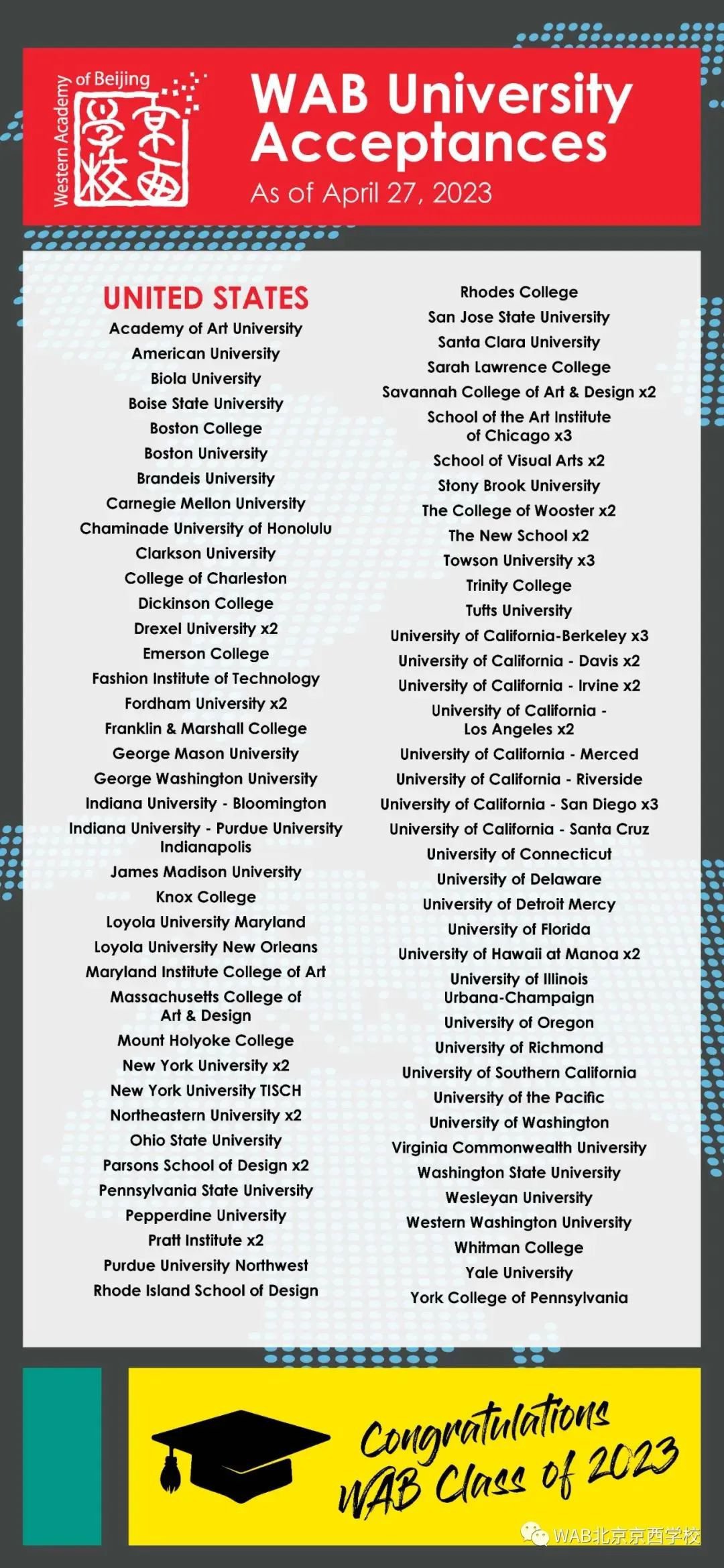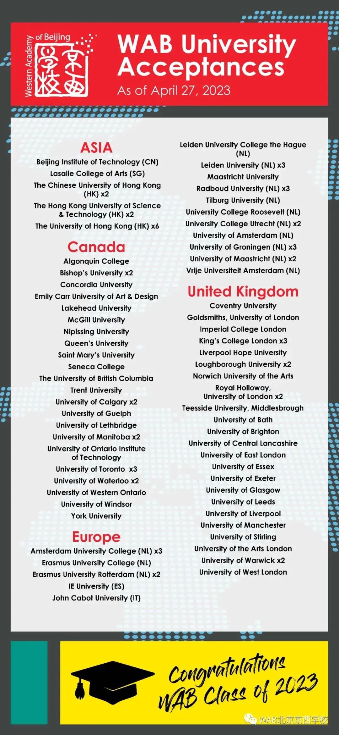 從去年11月到今年4月27日,WAB 2023屆學子持續收到各大世界頂尖名校的offer,并且,他們中的很多人都獲得了名校的獎學金。一起來看看WAB學子取得的輝煌成績吧!