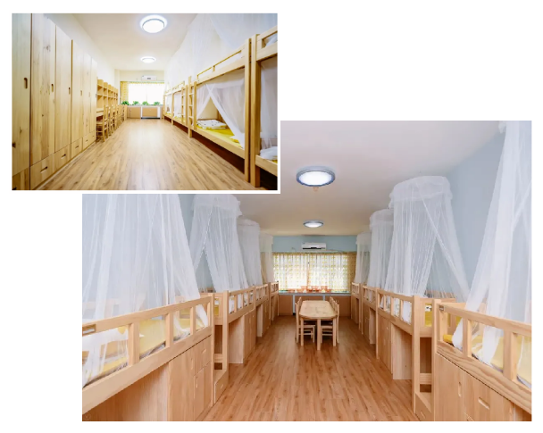 AB樓宿舍區:為凹型結構學生公寓,分A樓和B樓,共5層,每層17個房間,每間可安排4-5位學生住宿,宿舍配有公共學習室、活動室、洗衣房、盥洗室和廁所。