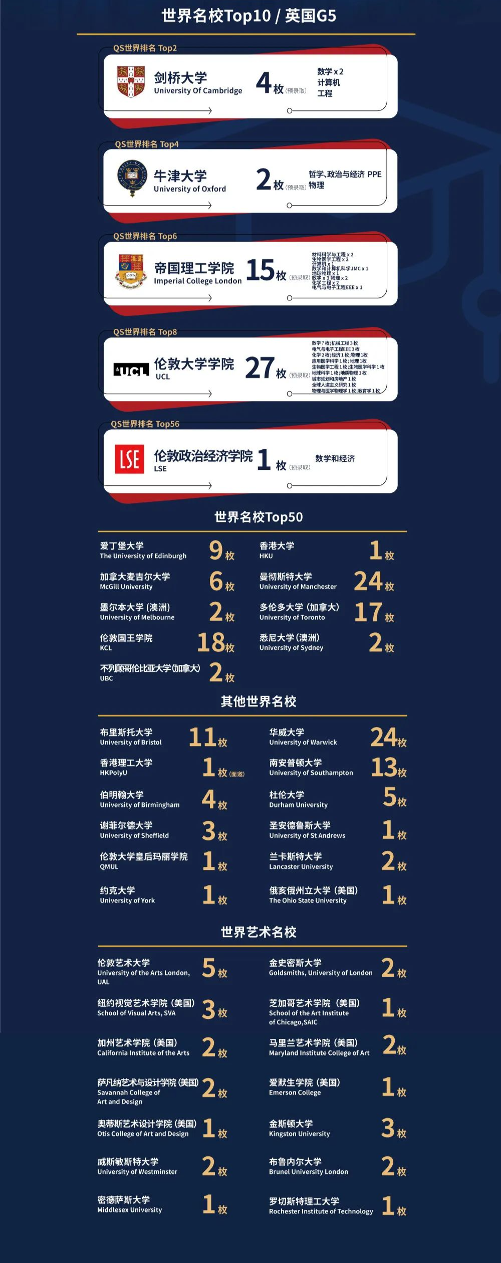 赫賢A-Level學部60多位準畢業生(含8位藝術升學同學),繼2022年的輝煌戰績之后,再次以220+的(預)錄取總額創下史上新高。申請國家/地區涵蓋英國、美國、加拿大、澳大利亞、中國香港等。截至目前,63%的同學獲得了至少一枚世界Top10綜合類大學/英國G5大學的(預)錄取,總計49枚。世界Top50綜合類大學(預)錄取數量達81枚,占比41%。8位同學英美雙申,成功收獲了世界頂尖藝術院校(預)錄取。