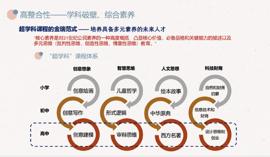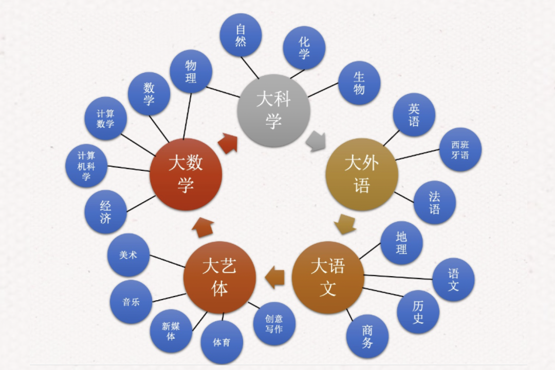包含在了大數(shù)學(xué)、大科學(xué)、大外語、大語文、大藝體幾個(gè)跨學(xué)科組之下,特點(diǎn)是高度整合、學(xué)科破壁,通過打通學(xué)科限制,更好的鍛煉學(xué)生跨學(xué)科思維的廣度。