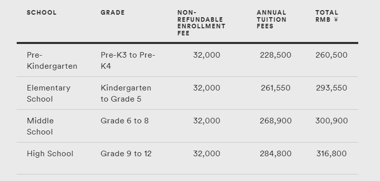 學費情況:高中學費為每年 RMB 31.68 W。其他年級學費詳情請見下圖