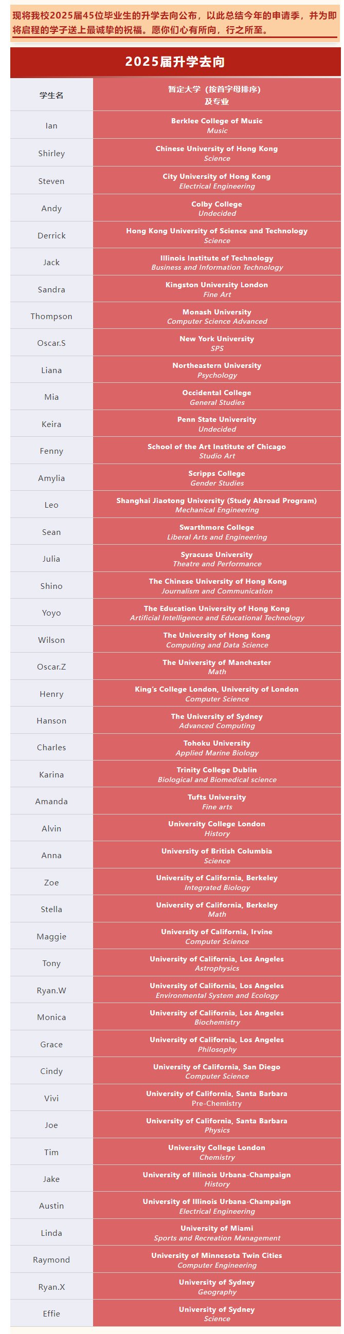 現(xiàn)將我校2025屆45位畢業(yè)生的升學(xué)去向公布,以此總結(jié)今年的申請季,并為即將啟程的學(xué)子送上最誠摯的祝福。愿你們心有所向,行之所至。