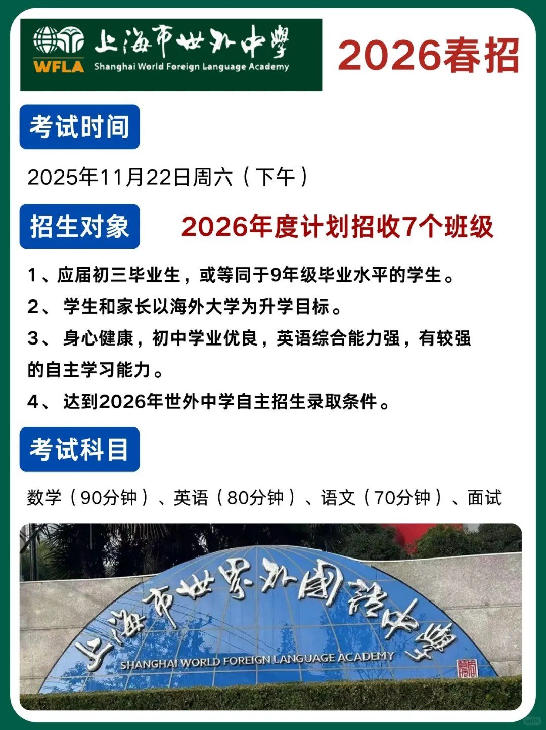 上海世外中學2026年度計劃招收7個班級,招生對象及條件如下: