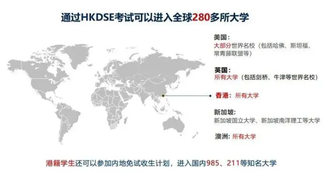非港籍生也可以用 DSE成績(jī)申請(qǐng)中國港澳臺(tái)或海外高校,大部分院校無需其他國際考試成績(jī)證明。