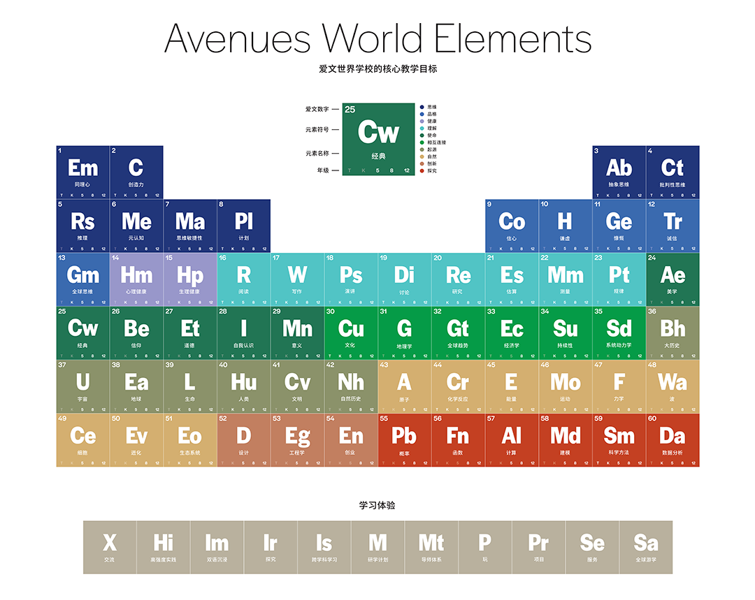 愛(ài)文的課程很特別,愛(ài)文打造了一個(gè)不拘泥于AP、IB等任何一個(gè)流行的教育體系:“世界元素”系統(tǒng)(AWE),是一套形式獨(dú)特、有如化學(xué)元素周期表的全球課程體系,涉及60個(gè)核心思想及其學(xué)習(xí)安排時(shí)間。