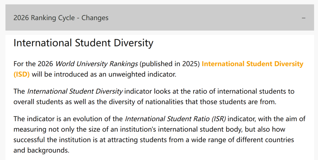 今年,根據QS官網信息,又將新增一項新的指標,叫國際學生多樣性(International Student Diversity,ISD),是原指標國際學生比例的演變,或者說升級。