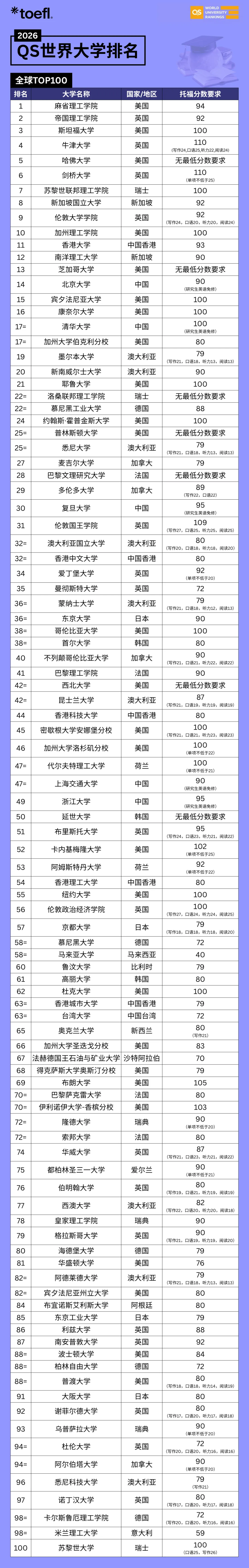 本篇對QS世界大學TOP100院校的雅思托福要求做出匯總,一起來看看吧!