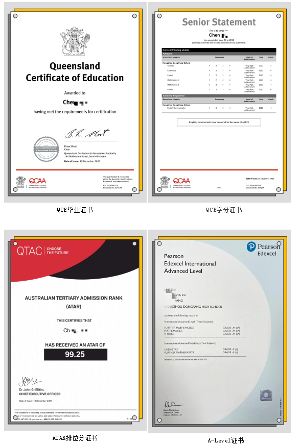 國際部QCE項目畢業(yè)生,完成課程學習且成績合格后,獲得澳大利亞昆士蘭州教育部簽發(fā)的三張證書,分別是QCE畢業(yè)證書,QCE學分證書,ATAR證書。A-Level項目畢業(yè)生,按照選課情況,完成所有模塊考試,合成最終A-Level證書。學生憑借兩個項目證書申請世界各國大學。